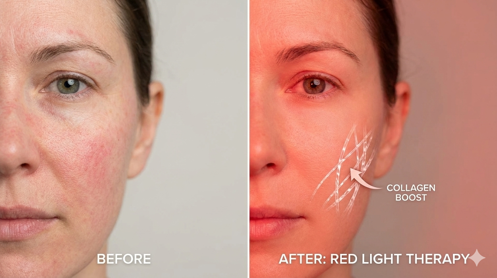 Red light stimulates fibroblasts → tighter, smoother skin.